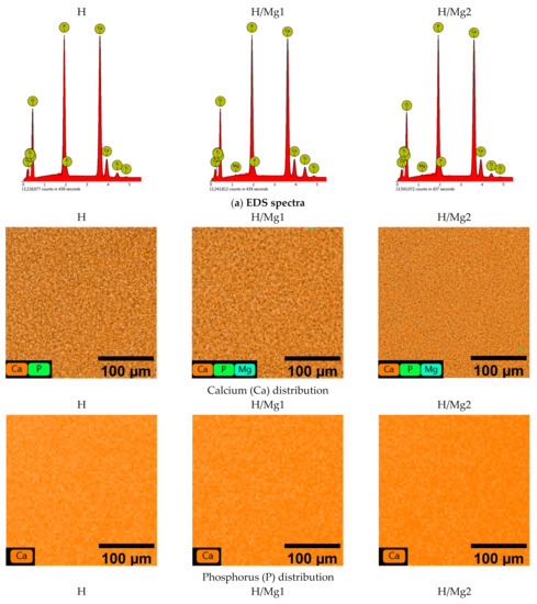 Thus, the addition of Mg into different concentrations slightly decreased the (Ca + Mg)/P ratio from a value of 1.59, obtained for the H coatings, to a value of 1.57 and 1.56, respectively, for H/Mg1 and H/Mg2 (Figure 4c). Nevertheless, it can be noted that all (Ca + Mg)/P ratios are smaller than that of stoichiometric HAp, indicating the formation of a Ca-deficient apatite.