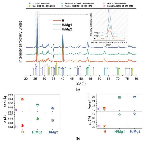 Another change that involves the diffraction peak at 26° consists of shifting the HAp main XRD peak toward the right, denoting the inclusion of the doping elements in the HAp structure. This is available when the ionic radius of the doping element is smaller than the one of Ca2+, which is also the case for Mg2+. By increasing the Mg amount, the XRD peaks became more intense, and some of the peak’s position shifted to the right, indicating lattice contraction caused by the Mg substitution. This effect could be explained by the increment of the crystallite size and lattice changes associated with Mg substitution in the HAp structure. As can be observed in Figure 5b(i,ii), compared to H coatings, the addition of Mg led to a slight decrement of the a parameter and an increment of the c parameter along with a higher crystallite dimension.