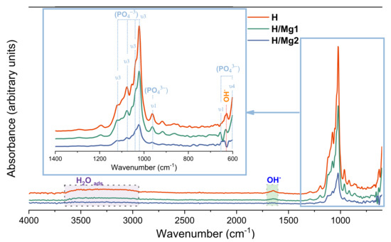 Compared with undoped HAp, a decrement in the intensity of the phosphate groups (PO4)3− was associated with the addition and increment of magnesium content. The observed FTIR spectral changes can also be related to the destabilization of the HAp structure by the incorporation of Mg2+ ions.