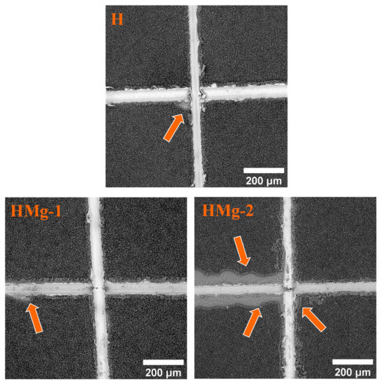 The adhesion of HAp coatings was investigated according to ASTM D 3359-17 standard (Standard Test Methods for Measuring Adhesion by Tape Test) [101], using an Elcometer 107 Cross Hatch Adhesion Tester kit (Ulmer, Aalen, Germany). Parallel cuts of 6 × 6 mm with gaps of 1 mm between them were made using a blade with cutting edges. Thus, a lattice pattern was generated. Over the lattice pattern indentation, the ASTM adhesive tape was placed. After 90 s, the tape was removed by pulling in a single smooth action at angle of 180° to the surface. The lattice pattern indentation was examined macroscopically and by scanning electron microscopy after the adhesion tests. In accordance with the ASTM D 3359-17 standard, the coating adhesion was assessed in terms of area removed, and it was classified in terms of percentages as follows: 5B—0%; 4B—≤5%; 3B—5–15%; 2B—15–35; 1B—35–65%; and 0B—≥65%.