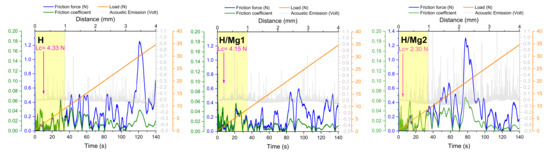 Complementary to this technique, a micro-scratch test was performed under similar conditions as the ones presented by Mokabber et al. [102]. The adhesion strength of the HAp-based coatings was performed with a TriboLab UMT tester, Bruker Ltd. (Billerica, MA, USA), using a diamond indenter with a radius of 0.2 mm, working in progressive load from 0.5 to 35 N, with a scratching speed of 1.7 mm/min over a length of 4 mm. The resulting scratches were analyzed by SEM, and the typical scratch curves obtained from the micro-scratch tests were plotted.