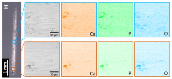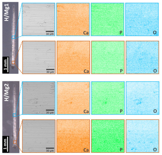 In terms of element distribution, all the identified elements (Ca, P, and Mg) are uniformly distributed on the investigated areas, with no visible agglomerations, proving a homogeneous coating.