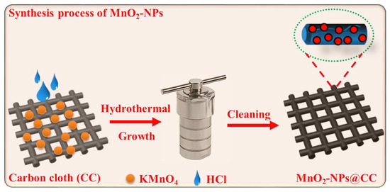 The MnO2-NPs precursor was synthesized through a simple and scalable hydrothermal strategy, in which the CC was used as a substrate, and MnO2-NPs were grown on the CC surface. Figure 1 shows a schematic illustration of the fabrication process of MnO2-NPs. Initially, 3 mg of KMnO4 was dissolved in 30 mL of distilled water, then 10 mL of hydrochloric acid (HCl) was slowly added. Afterwards, the above solution was sonicated and a purple solution was obtained. The cleaned CC substrate was put with the side wall of the Teflon-lined stainless steel autoclave and the purple solution was moved into a 70 mL autoclave that was sealed and then left for hydrothermal reaction for 12 h in an oven at 135 °C. After cooling down, the resulting precipitate was washed many times with distilled water and dried for 12 h at 90 °C.