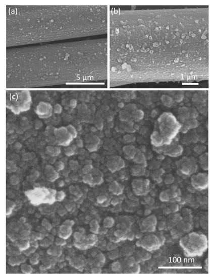 FESEM images of MnO2-NPs@CC. (a,b) low- and (c) high-magnification.