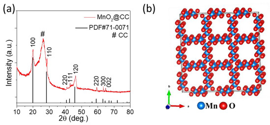 (a) XRD spectrum of MnO2-NPs@CC. (b) Hexagonal crystal structure of MnO2 with 2 × 2 tunnels.