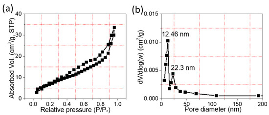 The specific surface area of MnO2-NPs@CC was investigated via nitrogen (N2) sorption measurements. The adsorption–desorption isotherms of MnO2-NPs@CC show a type IV curve with a clear hysteresis loop in the of range 0.4–1.0 (P/Po), as shown in Figure 5a. The figure shows typical characteristics of capillary condensation due to the mesopores in MnO2-NPs@CC [29]. The surface area of the mesoporous MnO2-NPs@CC computed using the BET method was 29 m2/g; thus, MnO2-NPs@CC may show excellent electrochemical performance because of its large surface area, meaning it can offer a better active site for the occurrence of redox reactions. The BJH profile for porosity is illustrated in Figure 5b, where the mean size of the pores was estimated to be 12.46 nm, demonstrating the presence of large pores. This porous architecture is believed to be beneficial for storing more energy due to the mesoporous channels and large surface area being suitable for ion diffusion, which are the two main characteristics needed for electrode materials to achieve better electrochemical performance.