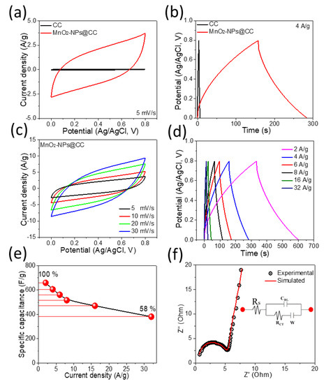 The MnO2-NPs@CC was investigated as an electrode for SC, and the electrochemical behavior was examined in a 6 M potassium hydroxide (KOH) solution in a three-electrode configuration. First, we tested the pristine CC substrate to find the effect on the performance of the MnO2-NPs@CC electrode. The comparative CV curves of the pristine CC and MnO2-NPs@CC electrode are displayed in Figure 6a. The area under the CV curve of the pristine CC is much lower than that of the MnO2-NPs@CC electrode at the same scan rate (5 mV/s). Furthermore, the GCD measurements were conducted and the comparative GCD curves are displayed in Figure 6b, which indicates that the capacitance generated from the pristine CC is tiny. Based on the CV and GCD results, we neglected the capacitance of the CC in the calculation. The CV curves for the MnO2-NPs@CC electrode within a voltage range of 0.0–0.8 V and at various scan rates (5–30 mV/s) are exhibited in Figure 6c. The CV profiles reveal rectangular shapes without additional redox peaks, even when scan rate was increased to 30 mV/s, which indicates the excellent electrochemical performance of the MnO2-NPs@CC [30]. The wide open spaces in the MnO2-NPs@CC electrode provide easy paths to diffuse the electrolyte ions in the interior section of the active material. The NPs grown on the CC surface offer a good surface area and rapid electron transfer channels. The GCD measurements of the MnO2-NPs@CC electrode at various current rates (2–32 A/g) are exhibited in Figure 6d. The linear and symmetric shapes of the GCD curves further confirm the good charge–discharge features and excellent reversibility. In addition, IR drops of 0.025 and 0.15 V were observed at 2 and 32 A/g, which indicated the quick I–V response with a small internal resistance from the active material. The major cause of an IR drop may be possibly due to charge transfer resistance or internal resistance of the active material or contact resistance at the electrode–electrolyte interface. The specific capacitance (Csp) for the MnO2-NPs@CC electrode was determined from the GCD profiles using Equation (1):