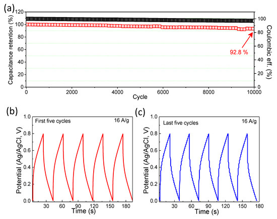 The cycling performance is also a paramount parameter for the characterization of SC electrodes. A long-term cyclic performance measurement of the MnO2-NPs@CC cathode was studied at a current density of 16 A/g (Figure 7a). The capacitance decreased slowly and reached 92.8% of the initial value after 10,000 GCD cycles, showing excellent electrochemical stability.