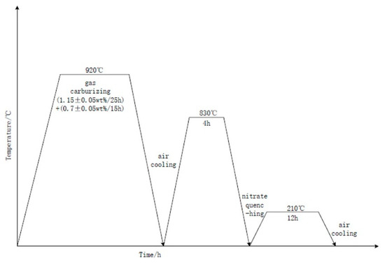 This gear is generally used for transmission devices. According to the service condition of the gear, it should be capable of frequently withstanding great force and braking load shocks. On this basis, the level of endurance, fatigue strength, and impact toughness for gear steel should meet these requirements [1,2]. 17CrNiMo6 steel is a kind of high-strength low carbon alloy steel used for gear steel. The chemical components of the 17CrNiMo6 steel sample were measured with Spectro type M10, as shown in Table 1.
