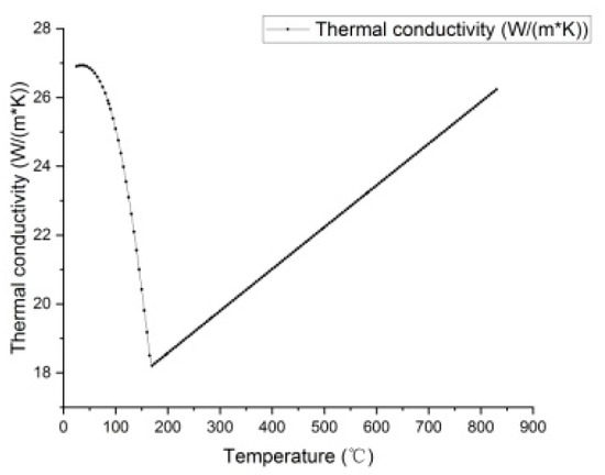 Figure 2 shows that the depth of the carburized layer is about 3.9 mm. Based on the chart, the chemical composition of different layers is achieved. From the surface to 2 mm, the amount of carbon changes rapidly. It is basically flat with the base metal at the depth of 3.5 mm, which has been ready for the property. This is because of the great importance of the cooling rates on the microstructure and property of the steel. The hardness of the steel will be higher with the increase in the cooling rate, and the toughness will be lower [21,22,23]. Therefore, to achieve more accurate results, during the calculation of the properties of the steel, it is necessary to use the methods of performance–temperature field and performance–microstructure iterations [24]. For the first time, the calculation of the properties from the case to the core is achieved through the steady-state module. Figure 3 and Figure 4 are the thermal conductivity and specific heat of the surface calculated by JMatPro software. At the critical point of phase transition, the thermal conductivity and specific heat capacity will decrease significantly.