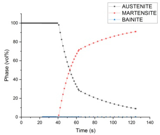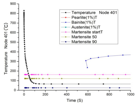Figure 10 and Figure 11 show the temperature and the time at which phases like martensite and bainite occur on the surface. Similar to martensite, which occurs at 165 °C and 40.98 s, when the time goes to 53.86 s, the temperature drops to 122.5 °C and the content of martensite reaches 50%. After quenching, the final structure is 9.65% austenite and 90.35% martensite, among which there is a very small amount of bainite. According to the cooling curve and CCT continuous cooling transformation curve, there should be no bainite at the surface cooling rate. The tissue content calculated by software is 0.01% bainite, and the content is extremely small. Compared with the charts that show the cooling curves and continuous cooling transformation curves, it is easy to illustrate that there is little bainite existing on the surface and a little bainite in the core of the model. Comparing the tissue composition obtained by calculation and simulation with that obtained by the cooling curve and CCT diagram, it can be seen that the tissue obtained by simulation and that deduced by the cooling curve and CCT diagram are approximately the same (Figure 12 and Figure 13).