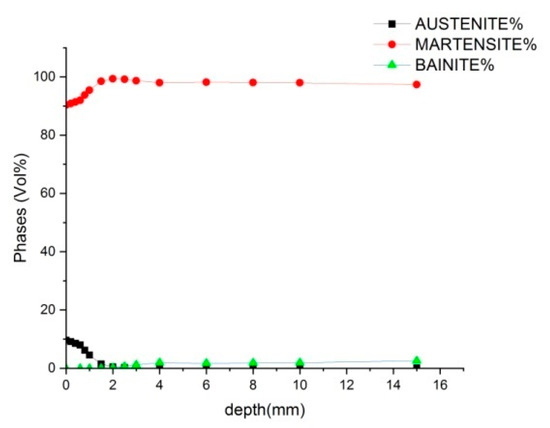 Table 7 shows the final distribution of the steel from the case to the core. As shown in Figure 14. As time passes, martensite occurs at a depth closer to the surface. Because of heat conduction, martensite finally occurs in the steel at the core. The transformation rate of steel at the core is much slower than that near the surface, so martensite finally occurs here.