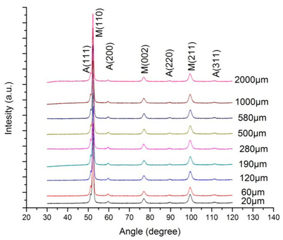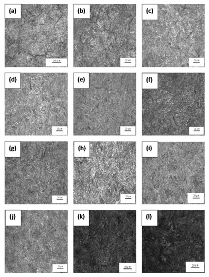 From Figure 16a, it is not very easy to clearly make out the outline of the martensite. When the depth is deeper in Figure 16d–f, the outline of the martensite becomes clearer. In the Figure 16h, when the depth is 120 μm, the outline of martensite is clear enough. In Figure 16h, where the depth is about 600 μm, the number of small white shapes reduces and the martensite is the acicular martensite. Figure 16l shows the micrographic of the core, where the shape of martensite is oversized because of the cooling rates.