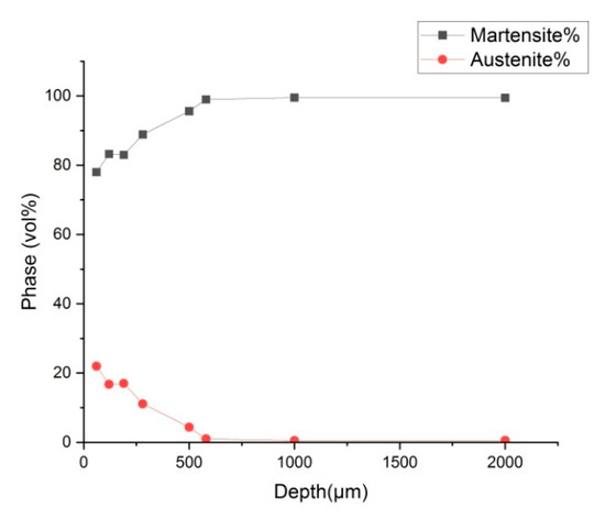 Figure 18 shows that there are seven peaks at each depth of the workpiece. Four of them are peaks of austenite and the others are martensite. The double peaks at the large degree were taken into consideration in the into calculation and the content of different layers from the case to the core was obtained using the direct and contrast method. Table 8 displays the answer, and the table is displayed as a chart. The chart shows that the content of martensite presents an increasing trend and the austenite presents a reducing trend, which is same as the result of the simulation.