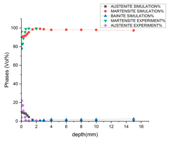 Taking the results of both the simulation and the experiments into consideration shows that the trends of the two results are the same in general; that is, the content of austenite has a reducing trend and the content of martensite has an increasing trend from the case to the core. Moreover, there is little bainite that exists near the core.