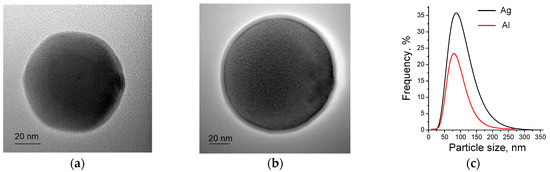 TEM images of the Al (a) и and Al/Ag (b) nanoparticles and nanoparticle size distribution curve (c).