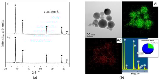 The peaks of the diffraction pattern (Figure 2a) correspond to planes 111, 200, 220, 311 and 222 in accordance with a powder diffraction file of the International Centre for Diffraction Data (ICDD), card No. 00-004-0787. In both cases, the lattice parameters are standard for aluminum and are 4.049 Å. According to the conventional Williamson−Hall plot, the crystallite size for Al/Ag nanoparticles is smaller than that for Al nanoparticles and is 40 ± 2 nm versus 55 ± 2 nm. The absence of Ag peaks in the diffraction pattern of Al/Ag nanoparticles may be due to its distribution in the particles in the form of X-ray amorphous clusters (Guinier−Preston zones). This phenomenon is associated with the formation of an oversaturated Al-based solid solution [45] and is characterized by the extremely small size of Ag clusters [46,47,48,49,50].