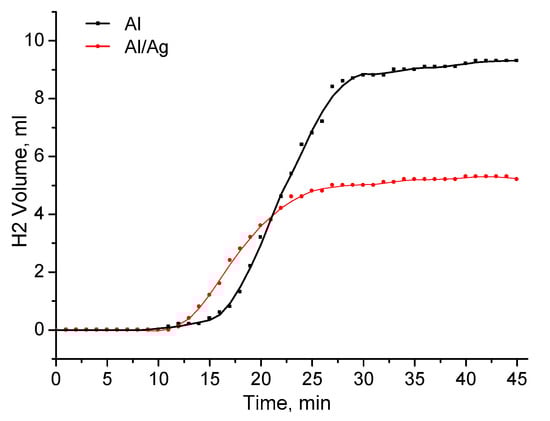 The amount of hydrogen released as a result of the aluminum−water interaction was used as an estimate of the amount of fixed nanoparticles on the ceramics (Figure 4). The obtained kinetic dependences had an S-shape form typical for hydrogen release during the water oxidation of Al powders [53]. Hydrogen release began after an about 10 min delay and was completed after 30 min both in the case of the oxidation of Al nanoparticles and in the case of the oxidation of Al/Ag nanoparticles. The reaction of the fixed Al nanoparticles with water resulted in the release of 9.4 mL of hydrogen, while the oxidation of Al/Ag nanoparticles resulted in the release of 5.3 mL. These amounts of hydrogen were released upon the complete oxidation of 7.5 mg and 4.2 mg of aluminum, respectively.
