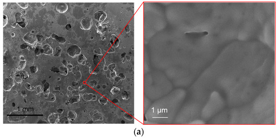 Figure 5 shows SEM images of the ceramic surface before and after modification. As can be seen, the pristine ceramic surface had multiple pores, and the ceramic structure was represented by grains with an average size of 5.1 ± 0.6 μm (Figure 5a). After ceramic modification by the water oxidation of Al and Al/Ag nanoparticles fixed on its surface, the formation of continuous porous coating and separate agglomerates of about 1 µm size was observed (Figure 5b,c). The agglomerates had a nanosheet structure similar to that formed as a result of the water oxidation of Al and Al/Ag nanopowder [41,52] (Figure 5b,c inset).