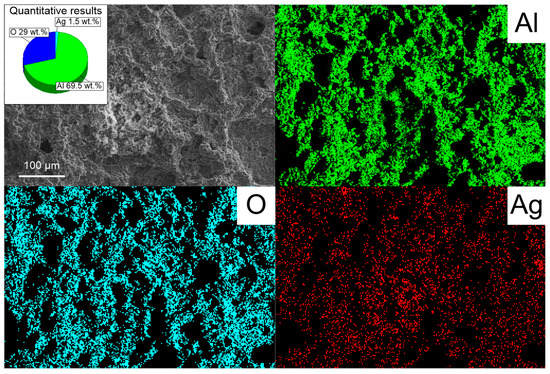 Elemental analysis of the modified samples’ surfaces indicated the presence of silver in the case of ceramic modification by the oxidation products of Al/Ag nanoparticles (Figure 5e).