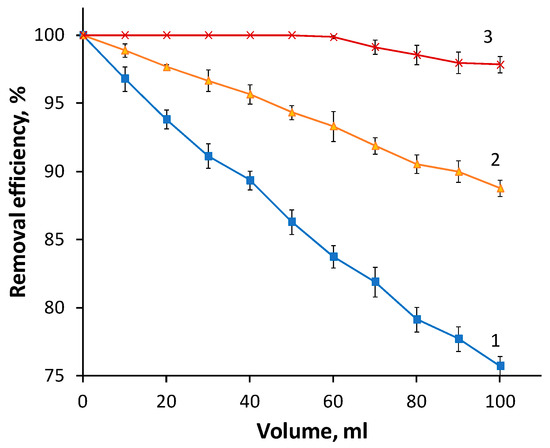 Figure 8 shows the efficiency of S. aureus removal from water as a function of the water volume passed through the macroporous ceramic samples. When passing 100 mL of water with a bacterial concentration of 105 CFU/mL through the pristine macroporous ceramics, the removal efficiency was 76% (Figure 8, curve 1). The modification of the ceramics with AlOOH nanostructures led to an increase in removal efficiency of up to 89% (Figure 8, curve 2), and when modified with AlOOH/Ag (Figure 8, curve 3) nanostructures, the efficiency was 98%. At the same time, for the sample containing silver, the removal efficiency after passing 50 mL of contaminated water was 100%.