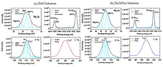 In order to correlate the EDS elemental quantification analysis (Figure 2) with the composition of electroless deposits formed on the Mg-Ca0.3 surface, XPS analysis was carried out; Figure 3 presents the high-resolution spectra of Mg, Zn, O and C elements. The O1s spectrum shows a maximum peak at ≈531.9 eV associated with the presence of hydroxide [66,67,68,69,70], as also two deconvoluted peaks at ≈531.2 eV ascribed to metal oxide [71,72,73,74,75,76,77] and at ≈532.3 eV belonged to inorganic carbonate [66,67,73,78,79,80]. The high-resolution spectrum of Mg2p presented a maximum peak at ≈50.2 eV associated with the presence of MgO [67,69,71,72,81]; likewise, two deconvoluted peaks were detected at ≈49.8 eV ascribed to Mg(OH)2 [66,67,68,69], and at ≈51.2 eV suggesting the presence of MgCO3 [66,67,73]. The high-resolution spectrum of C1s presented a maximum peak at ≈287.9 eV associated with the presence of carbon in MgCO3 [66,67,73]. Because of the spin-orbit splitting, the Zn2p spectrum has two peaks: at ≈1045.7 eV, characteristic of ZnO [66,67,73,74,75,78,79,80,81], and at ≈1022.5 eV associated with the presence of ZnCO3. According to a previous study, MgO has shown a high potential for CO2 adsorption due to its high porosity and the tunable nature of the pores [82]. The formation of ZnCO3 is associated with the CO2 adsorption on polar surfaces of ZnO, where CO2 dissociates at oxygen vacancy [83]. It may be noted that the deposits obtained from Zn(NO3)2 solution exhibited ≈3 times higher intensity of the Zn2p spectrum peaks (Figure 3b) than those of the deposits achieved from the ZnO solution (Figure 3a). These facts correlate with the EDS analysis (Figure 2).