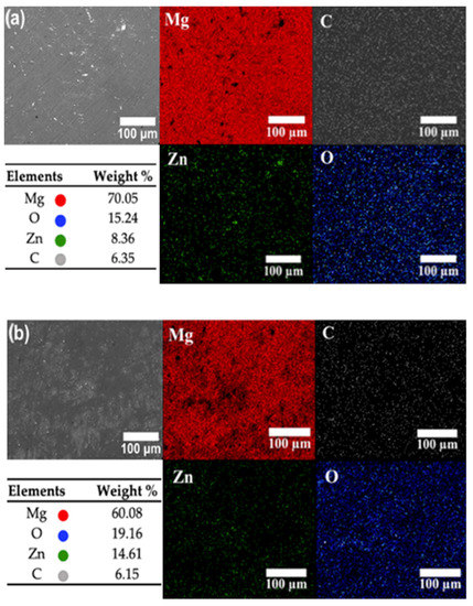 Figure 4 presents the EDS maps (200×) of Mg, Zn, O and C elements (wt.%) and their distribution as a part of the ZnO electroless deposits on Mg-Ca0.3 (Figure 4a,b). As it was suggested by the XPS analysis (Figure 3), the Mg, O, C and Zn belong to the MgO, Mg(OH)2, MgCO3, ZnCO3 and ZnO compounds. The deposits obtained from Zn(NO3)2 aqueous solution (Table 2) presented ≈2 times higher concentration of Zn (Figure 4b) compared to the content of Zn of the deposit from ZnO solution (Figure 4a).