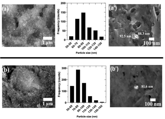 Figure 5 displays the particle size distribution of ZnO (this analysis was carried out with the ImageJ software of the National Institutes of Health, Bethesda, Maryland, USA). Note that the average size of an individual particle is ≈90 ± 3 nm (Figure 5a) and ≈79 ± 3 nm (Figure 5b). Furthermore, the frequency of these ZnO nanoparticles is ≈2 times higher for the ZnO deposits (Figure 5b) obtained from the Zn(NO3)2 solution (Table 2) and apparently more dispersed on the surfaces (Figure 2). Figure 5a′,b′ present the SEM images (100,000×) of isolated particles on the Mg-Ca0.3 surface for both deposits, which size agrees with the particle distribution analysis (88.3, 92.5 and 81.6 nm).
