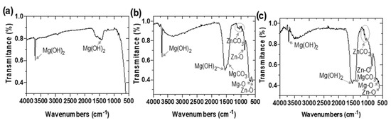 Figure 6 shows the FTIR spectra (Specular Apertured Grazing Angle) of the ZnO electroless deposits on the Mg-Ca0.3 surfaces. The peak at ≈650 cm−1 is characteristic of the Mg-O vibration [84,85], while the narrow peaks at ≈3680 cm−1 and ≈1510 cm−1 were attributed to the vibration of the structural hydroxyl group in Mg(OH)2 [85,86], both compounds as corrosion products formed in aqueous solutions (Figure 6b,c). Additionally, very faint bands between ≈960 and 1140 cm−1 are assigned to a very small amount of poorly crystalline ZnCO3 (smithsonite) [87,88]. The peak observed at ≈1430 cm−1 was associated with MgCO3 [87,89] and those at ≈860 cm−1 and ≈600 cm−1 as characteristic of the Zn-O bond [90,91,92,93,94,95].