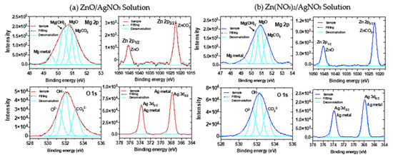 XPS spectra of ZnO/Ag hybrid deposits on Mg-Ca0.3 surface, electroless achieved from aqueous solutions (10−3 M, at 21 °C): (a) ZnO/AgNO3 and (b) Zn(NO3)2/AgNO3 solutions.