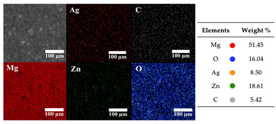 Similarly, the analysis of the EDS maps (200×) of the ZnO/Ag electroless deposits on the Mg-Ca0.3 surface (Figure 11 and Figure 12) indicates that ≈2 times higher concentration of Ag was nucleated on the ZnO/Mg-Ca0.3 surface (Figure 11), which was less covered by clusters of electroless ZnO, previously obtained from ZnO solution without Ag (Table 1).