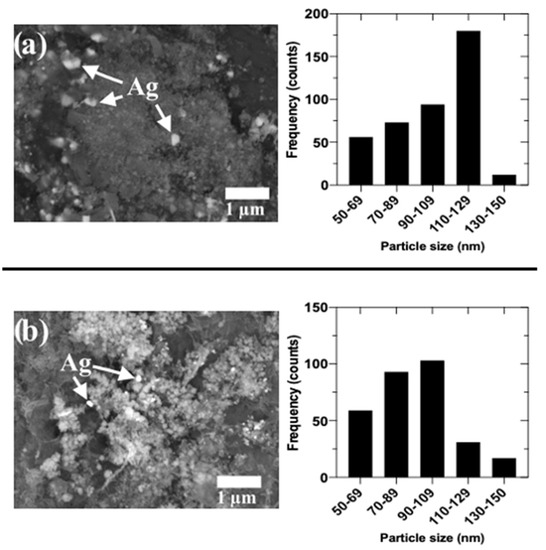 SEM images (20,000×) and particle size distribution of Ag as a part of the hybrid ZnO/Ag deposits on Mg-Ca0.3 surfaces, electroless achieved from aqueous solution (10−3 M, at 21 °C): (a) ZnO/AgNO3 and (b) Zn(NO3)2/AgNO3 solutions.