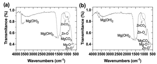 FTIR spectra of the hybrid ZnO/Ag-NPs deposits on Mg-Ca0.3 surfaces, electroless achieved from aqueous suspensions (10−3 M, at 21 °C): (a) ZnO/AgNO3 and (b) Zn(NO3)2/AgNO.