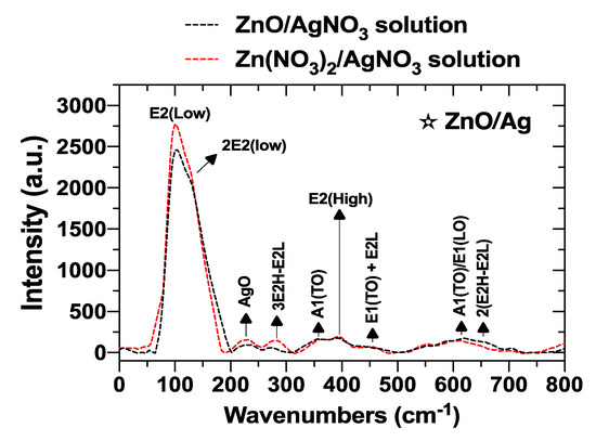Figure 16 presents the Raman scattering spectra of the hybrid ZnO/Ag deposits. The peak of Ag detected at 230.94 cm−1 may associate with the Ag-O bond, according to the literature [111,112,113,114].