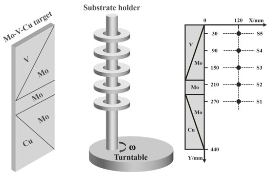 The Mo-V-Cu-N coatings were prepared on WC-Co cemented carbide and 316 L stainless steel substrates using high-power impulse magnetron sputtering (HIPIMS). A schematic diagram of the Mo-V-Cu target (69 mm × 443 mm, 99.9% purity) is shown in Figure 1. The sample distances from the top of the target were set at 30, 90, 150, 210, and 270 mm. To remove the scratches on the substrate surface, 1500 G and 3000 G diamond grinding discs were used to grind the substrate surface for 15 min, respectively. Then, a diamond polishing paste with a particle size of 1 μm was used to polish the substrate surface for 10 min to achieve the mirror polishing effect. All the polished substrates were ultrasonically cleaned, and then placed on a substrate holder that rotated at a speed of 4 r/min to keep all the substrates facing the target, whereas the turntable did not rotate. Before deposition, the chamber was pumped to less than 5.0 × 10−3 Pa and then heated to 200 °C. To clean surface contaminants, the substrate surface was etched by Ar+ plasma at a high bias voltage of 1000 V for 30 min. In addition, due to a high ionization rate and ion bombardment, the substrate surface was bombarded by Cr+ ions using arc ion plating (AIP) to enhance the adhesion strength, which operated at a high bias voltage of 800 V for 5 min. Then, a mixed gas of Ar (35 sccm) and N2 (10 sccm) with a pressure of 0.6 Pa was introduced. The Mo-V-Cu-N coatings with various compositions were deposited by HIPIMS. The target power and duty cycle were kept at 1.5 kW and 2%, respectively. During deposition, the DC bias voltage of the substrate and the deposition time were set at 200 V and 400 min, respectively.