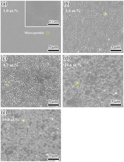 Figure 2 displays the surface SEM morphologies of Mo-V-Cu-N coatings. In Figure 2a, the Mo45V1Cu30N24 coating presented a smoother surface than other compositions. However, some small microparticles were observed on the smooth surface, which is a typical growth defect that is induced by the deposition of arc ion plating (AIP) [26]. In our previous study [6], the Mo-Cu-V-N coatings deposited by HIPIMS exhibited a smooth surface without any microparticles observed. A similar phenomenon was also observed in Mo-Cu-N [15], Mo-V-N [18], and Mo-V-Ag-N [19] coatings that were deposited by magnetron sputtering. In this study, before coating deposition, the Cr+ ions were introduced to clean the substrate surface. Thus, these microparticles were mainly caused by the evaporation of the Cr target with AIP during the etching process. As V content increased, the microparticles on the coating surfaces increased, including both the microparticle sizes and numbers, which can be related to the decrease in the coating thickness. A similar phenomenon was found in our previous study [21]. These microparticles formed in the bottom layer were gradually covered with increasing coating thickness. In addition, with the increase of V content, the surface morphology changed from a smooth surface to a scale-like structure, as shown in Figure 2b,c, and then to a plate-like structure, as shown in Figure 2d,e. Compared to Cu, Mo and V have a higher ion/atom ratio in the plasma. More Mo and V ions can be accelerated to the coating surface under the bias voltage of the substrate, which enhances the ion bombardment effect during deposition. The formation of scale-like and plate-like structures would be induced by the enhanced ion bombardment and etching effect. A similar plate-like structure was also observed for the deposition of AlTiVCuN coatings due to strong ion bombardment [27].