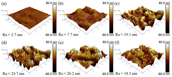 Figure 3 and Figure 4 show three-dimensional AFM images of Mo-V-Cu-N coatings that were deposited on WC-Co cemented carbide and 316 L stainless steel substrates. Before deposition, the polished WC-Co and 316 L substrates showed extremely smooth surfaces with low surface roughnesses of 2.7 and 0.6 nm, respectively, as shown in Figure 3a and Figure 4a. After deposition, the coated substrates exhibited uneven three-dimensional morphologies, especially for the WC-Co substrates. During the deposition process, some atoms were sputtered and ionized, such as Mo+ and V+ ions, which reacted with nitrogen and then bombarded the substrate surfaces under a bias voltage, resulting in a typical atomic peening effect [28]. Therefore, with increasing V content, the (Mo + V) content also increased, which enhanced the ion bombardment, leading to an increase in the surface roughness. As shown in Figure 5, for the cemented carbide and stainless steel substrates, the surface roughness of the coatings presented a similar trend with increasing V content, which increased from 7.7 and 2.0 nm at 1.0 at.% V to 26.2 and 14.7 nm at 14.6 at.% V, respectively. When the V content increased to 19.0 at.%, the surface roughness decreased to 18.5 and 12.5 nm, respectively, indicating that the intensity of ion bombardment was weakened. Compared to the V atoms, Mo has a higher ion valence and relative atomic mass, contributing to much stronger ion bombardment during the deposition process. Thus, the reduction in surface roughness can be related to a sharp decrease in the Mo content in the coatings. Compared to the WC-Co substrates, the surface roughness of the coatings deposited on 316 L substrates was much lower, demonstrating that a polished substrate with low surface roughness contributed to the deposition of smooth coatings.
