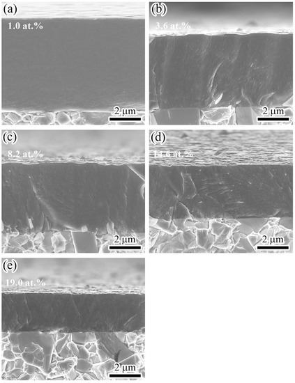Cross-sectional micrographs of Mo-V-Cu-N coatings with various V contents: (a) 1.0 at.%, (b) 3.6 at.%, (c) 8.2 at.%, (d) 14.6 at.%, and (e) 19.0 at.%.