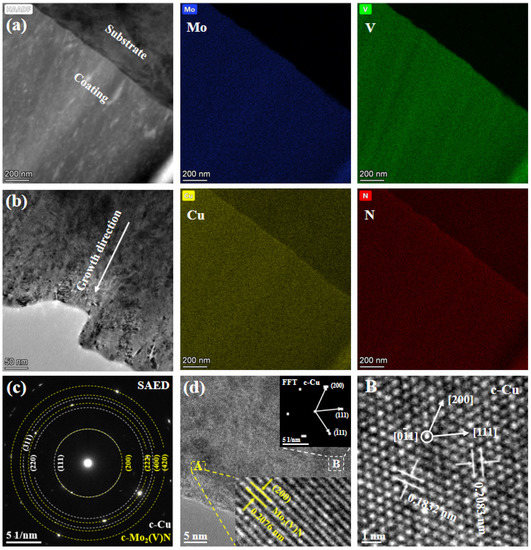 Figure 8 presents the cross-sectional TEM and HRTEM images of the Mo45V1Cu30N24 coating. As shown in Figure 8a, a clear interface between the coating and substrate can be identified in the HAADF image. The EDX element mappings showed that all the elements, including Mo, V, Cu, and N, were uniformly distributed in the cross-section and formed a typical nanocomposite structure. From the TEM bright-field image in Figure 8b, a dense columnar structure formed along the growth direction. The SAED pattern in Figure 8c showed incontinuous diffraction points belonging to the (200), (222), and (420) planes of the c-Mo2(V)N phase, and the (111), (220), and (311) planes of the c-Cu phase, respectively. The d-spacings of the Mo2(V)N and Cu phases in Table 3 were in good agreement with that of the standard Mo2N (PDF#25-1366) and Cu (PDF#85-1326) phases, implying that a double-phase of c-Mo2(V)N and c-Cu existed in the coating. In addition, based on the high-resolution HRTEM image and FFT pattern in Figure 8d, the lattice fringe spacing in region A was 0.2076 nm, which can be identified as the (200) plane of the c-Mo2(V)N phase. In region B, two lattice fringes with spacings of 0.2083 and 0.1832 nm corresponded to the (111) and (200) planes of the c-Cu phase, respectively. Thus, it demonstrated the existence of a double-phase structure of c-Mo2(V)N and c-Cu in the Mo45V1Cu30N24 coatings.