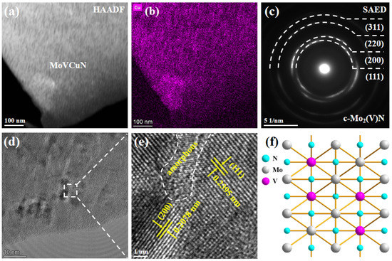 Figure 9 displays the cross-sectional TEM and HRTEM images of the Mo38V19Cu1N42 coating. From the HAADF image and corresponding EDX element mapping in Figure 9a,b, it can be seen that Cu element was uniformly distributed in the cross-section. In Figure 9c, some incontinuous diffraction rings can be observed in the SAED pattern, corresponding to the (111), (200), (220) and (311) planes, implying that a single solid solution phase of c-Mo2(V)N formed in the coating, which was consistent with above XRD results. However, no diffraction rings of the Cu phase appeared in the SAED pattern. In addition, based on previous XPS analysis of the Mo-Cu-V-N coatings [7], Cu was found to exist as a metallic species instead of Cu-N or Mo-V-Cu-N in the coatings. Similar results have been found in the Ti-Cu-N [31] and TiAlN-Cu [32] coatings that Cu existed as a metallic species rather than dissolved into the Ti-N and Ti-Al-N lattices. Due to Cu being immiscible in the hard phase (MeN, Me = Ti, Zr, Mo, etc.), soft metallic copper is often added as a second phase into the transition metal nitride and formed a typical nanocomposite structure [33]. In addition, due to an excellent diffusion barrier capability against Cu [34], most Cu atoms existed at the grain boundary rather than in the Mo2N grains [14]. A similar result was also found in the Mo-Cu-N coatings that Cu atoms existed as an amorphous phase at the grain boundary when Cu content was below 11 at.% [15]. In this study, due to the low contents (0.9–6.5 at.%), the metallic Cu might also exist as an amorphous phase in the Mo-V-Cu-N coatings. From the HRTEM image in Figure 9d,e, two lattice fringes with spacings of 0.2395 and 0.2078 nm can be identified. These values of d-spacing were between those of the γ-Mo2N (0.2404 and 0.2081 nm) and c-VN (0.2390 and 0.2070 nm) phases, respectively. This demonstrated that V atoms dissolved into the γ-Mo2N lattice, and formed a solid solution phase of c-Mo2(V)N. A schematic diagram of the (220) plane of the Mo2(V)N phase is presented in Figure 9f.