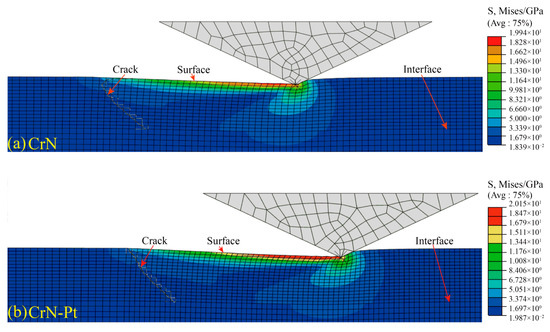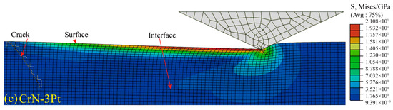 The comparative simulation analysis reveals that the normal load of 100 mN produces penetration cracks and separation of the coating–substrate for all three coatings, so such load simulation results are taken for analysis. Figure 2a–c shows the stress nephogram of CrN, CrN-Pt and CrN-3Pt coatings when the crack extends to the coating–substrate interface under a normal load of 100 mN.