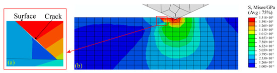 The second stage: Downward expansion of coating cracks. Figure 6 shows the stress clouds of the CrN-3Pt coating when the cracks extend to half of the coating thickness. Analyzing Figure 6 and observing the dynamic simulation process of crack extension of the three coatings, it is clear that as the indenter continues to slip, stresses continue to be generated inside the three coatings. Under the stress, the cracks expand along the Y-direction toward the deeper part of the coating. At the same time, many irregularly arranged small sub-cracks are generated along the X-direction on the side of the main crack, so that the coating presents a synergistic damage state with cracking mainly along the Y-direction and delamination along the X-direction.