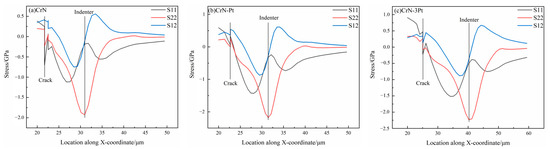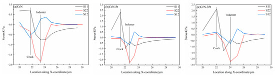 Anisotropic stress distribution in the middle of the three coating cracks when the crack propagates to half of the coating thickness. (a) CrN; (b) CrN-Pt; (c) CrN-3Pt.