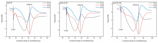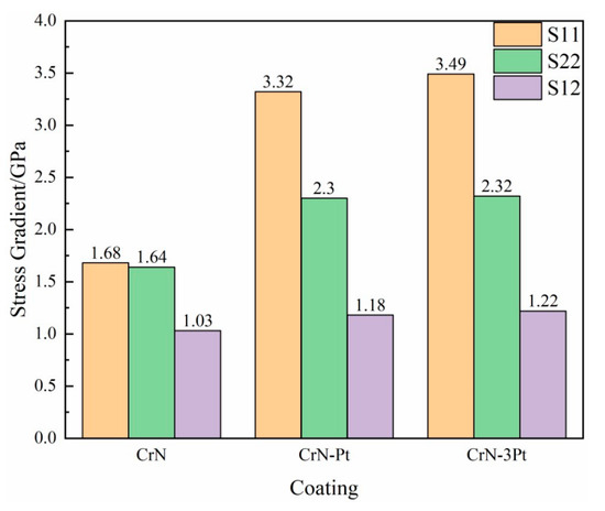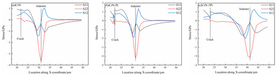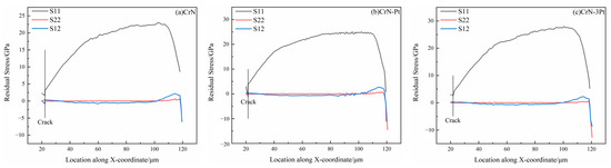 When the crack is fully extended to the coating–substrate interface, the critical loads of the three coatings are measured and obtained as shown in Table 4. The adhesion energy between the coating and substrate of the three coatings can be calculated according to Equation (1) as shown in Table 4. The comparison analysis shows that the film base bond strength of the CrN coating is the highest, the film base bond strength of the CrN-Pt coating decreases, and the film base bond strength of the CrN-3Pt coating is the worst, which indicates that the CrN coating is more difficult to peel off. The distribution of the three-way residual stresses along the X-direction of the bonding surface of the three coatings is shown in Figure 17, and the gradient of the three-way residual stresses is calculated in Figure 18, which shows that the maximum residual stresses at the bonding surface of the three coatings are still dominated by the S11 tensile stresses and have the largest gradient, indicating that the S11 residual tensile stresses at the bonding surface of the three coatings will be the main cause of the separation of the coatings under loading. Comparing and analyzing the S11 gradient values of the three coatings, it can be seen that the S11 gradient value of the CrN coating is the smallest, the bonding strength of the coating–substrate is the best, while the S11 gradient of the CrN-3Pt coating is the largest, and the bonding strength of the coating–substrate is the worst, which is consistent with the calculation results in Table 4.