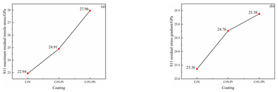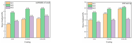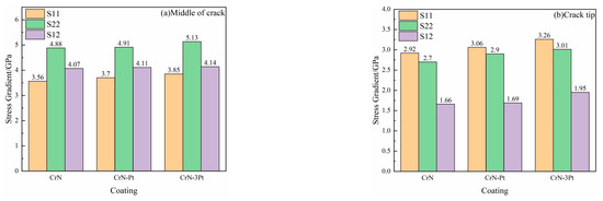 In order to study the influence of doping Pt elements with different contents on the fracture resistance behavior of the CrN coating surface, the distribution of three-dimensional residual stress components along the X-direction on the coating surface after the simulation is extracted respectively, as shown in Figure 14, and the three-dimensional residual stress gradient is calculated as shown in Figure 15. Observation shows that the coating surface is dominated by the residual stress S11 tensile stress, with a large gradient, while S22 and S12 are almost zero with a small gradient, indicating that the S11 residual tensile stress of the three coating surfaces will become the main reason for the coating surface to resist fracture behavior under loading. The maximum residual tensile stress S11 values of the three coatings in Figure 14 are extracted and compared (see Figure 16a): the maximum residual tensile stress S11 value of the CrN coating is the smallest, and its surface is the least prone to fracture. The maximum residual tensile stress S11 of the CrN-Pt coating increases, and the degree of surface fracture decreases. With the increase in Pt content, the maximum residual tensile stress S11 value of the CrN-3Pt coating reaches the maximum, and the surface is the most prone to fracture. The maximum residual tensile stress S11 gradient of the three coating surfaces is further compared and analyzed (see Figure 16b), which also proves the analysis results of the fracture resistance behavior of the three coating surfaces.