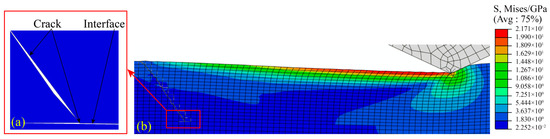 Stress nephogram of the CrN-3Pt coating when the crack propagates to the coating-substrate interface: (a) Crack enlargement, (b) State of crack.