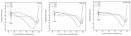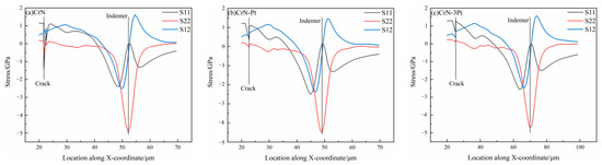 In order to analyze the relationship between the three stress components S11, S22 and S12 and crack sprouting, the distribution values of the three stress components along the X-direction of the coating surface when cracks start to occur in the three coatings were extracted separately (as shown in Figure 4), and the stress gradients of the three stress components were calculated as shown in Figure 5. When the coating surface cracks, the first large abrupt change in stress in all directions of the surface will occur at the crack location [31,32].