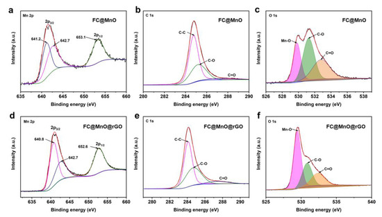 The elemental compositions of FC@MnO and FC@MnO@rGO were analyzed by XPS testing. The predominant peaks at ~284.2 eV, ~531.6 eV and ~641.0 eV arise from C 1s, O 1s and Mn 2p (Figure S2d), respectively [14]. The proportions of C, O and Mn elements in FC@MnO@rGO were 69.20, 23.51 and 7.29 at%, respectively, while the C, O and Mn elements were 79.34, 17.33 and 3.33 at% in FC@MnO, as shown in Table S1, suggesting that the proportions of O and Mn elements were improved by the enveloped rGO. The Mn 2p spectra show two main peaks at ~641 eV and ~653 eV, assigned to Mn 2p3/2 and Mn 2p1/2 (Figure 3a,d). The spin-orbit splitting of Mn 2p is separated into a double state of 12.3 eV, indicating that Mn (II) is the main ingredient in the composite materials [23]. The shift in Mn 2p bonding energy indicates the strong interaction between carbon materials and MnO [11,24]. The C 1s spectra shown in Figure 3b,e are well fitted with three peaks at ~288.9 eV, ~285.9 eV and ~284.7 eV, which are assigned to C=O, C-O and C-C bonding, respectively. The deconvolution of O1s spectra displayed in Figure 3c,f reveals that O 1s is fitted to Mn-O, C-O and C=O bonding, respectively, also indicating the presence of MnO. Meanwhile, the intensity of Mn-O increases with the addition of rGO wrapped. These results show that rGO is successfully coated on FC@MnO, which is consistent with the results of SEM and TEM (Figure 2). The XPS surveys of FC@MnO@rGO, FC@MnO@rGO-1 and FC@MnO@rGO-2 are shown in Figure S2d, indicating that the three composite materials have analogous elemental composition and surface chemistry.