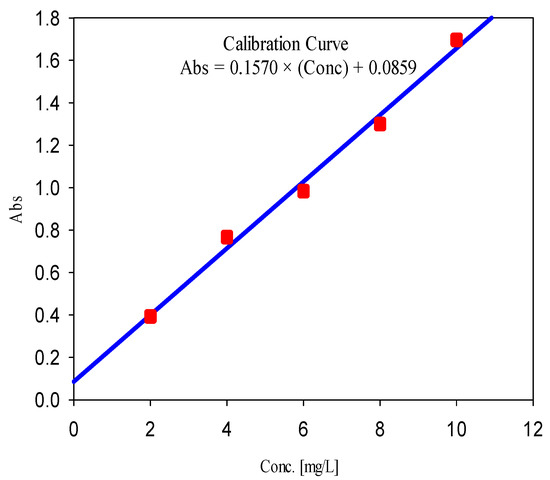 The MB concentration in feed and permeate was measured using UV/Vis. spectrophotometer (model T80+ UV/VIS spectrometer, PG instruments, Australia) at the wavelength corresponding to the maximum absorption (λmax = 663 nm). The calibration curve in the concentration range of 10 ppm is shown in Figure 1 (also, see Supplementary Materials).