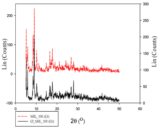 M101 was characterized by XRD before and after anion stripping to verify its synthesis accuracy. As depicted in Figure 2, M101’s XRD pattern showed clearly separated peaks at angles (2θ) of 9.05°, 17.8°, and 26.8°. The M101 and M101Cl graphs are in good agreement both in the literature and in this work, indicating that these MOFs were successfully synthesized [48]. The crystallinity of the material (M101Cl) was retained after anion stripping. Actually, M101Cl still maintained some characteristics of M101, such as porosity and pore structure [43].